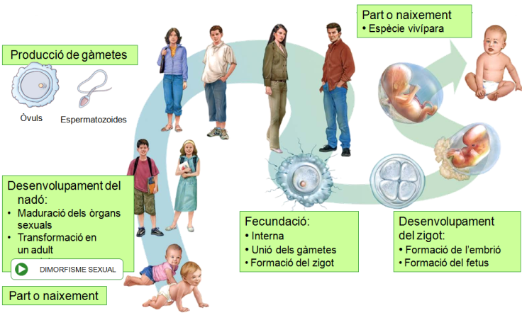 Les persones ens reproduïm sexualment. Les dones produeixen gàmetes femenins anomenats òvuls, i els homes, gàmetes masculins anomenats espermatozoides. Aquestes dues cèl·lules reproductores s'uneixen per formar un zigot.