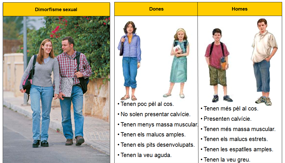 Dimorfisme sexual: Els homes i les dones, a més de tenir aparells reproductors diferents, tenim un dimorfisme sexual força marcat.