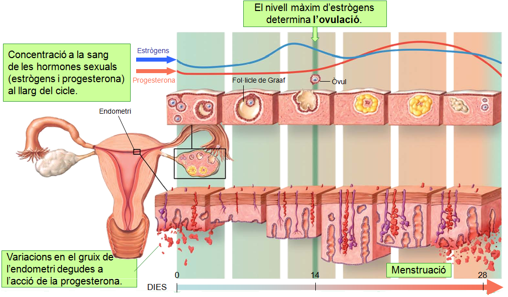 Les hormones sexuals femenines son els estrògens i la progesterona. El nivell d'estrògens segueix un procés cíclic. Quan el nivell és mínim, s'indueix la formació d'un fol·licle de Graaf. Dins del fol·licle es produeix la maduració d'un òvul. Quan el nivell d'estrògens es màxim, es produeix l'ovulació. Després d'alliberar l'òvul, el fol·licle de Graaf es transforma en el cos luti o groc que produeix progesterona que indueix el creixement i la maduració de l'endometri, el teixit que recobreix l'úter i on s'ha d'implantar l'òvul fecundat.