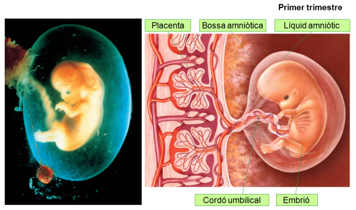 - Placenta. És un òrgan que es forma a la paret de l'úter. La seva funció és unir l'embrió a la mare, perquè aquesta pugui nodrir-lo mentre és al seu interior.