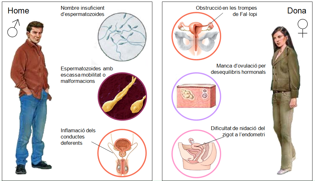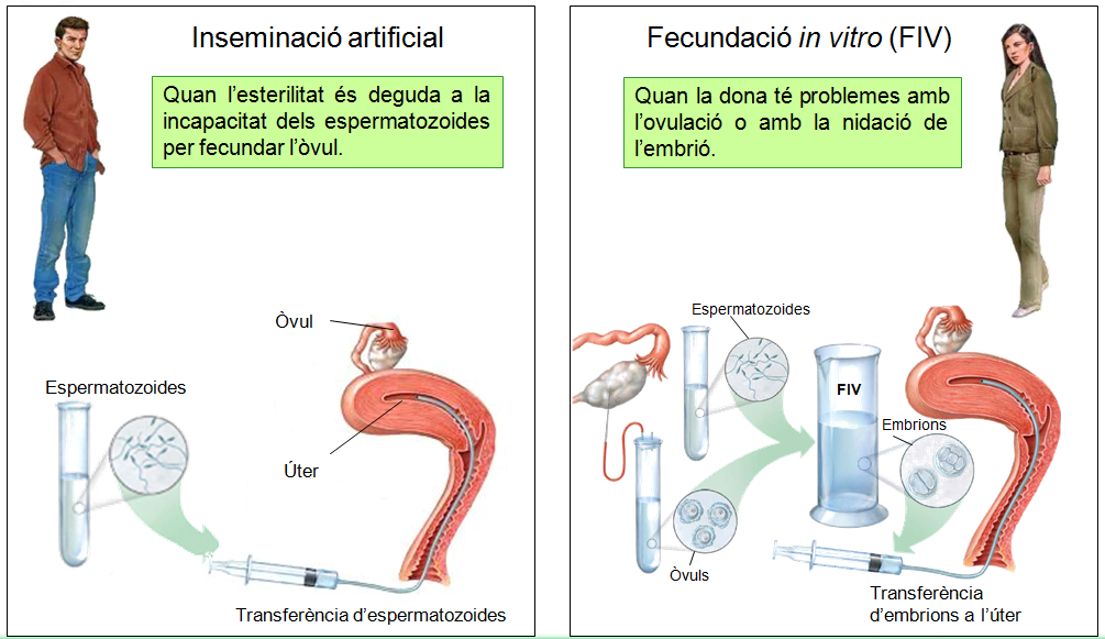 - Inseminació artificial. S'utilitza quan els espermatozoides tenen dificultats per fecundar l'òvul. Consisteix en la introducció dels espermatozoides a l'úter de la dona.
